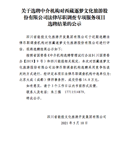 关于选聘中介机构对西藏逐梦文化旅游股份有限公司法律尽职调查专项服务项目选聘结果的公示