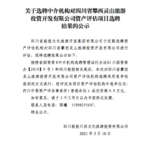 关于选聘中介机构对四川省攀西灵山旅游投资开发有限公司资产评估项目选聘结果的公示