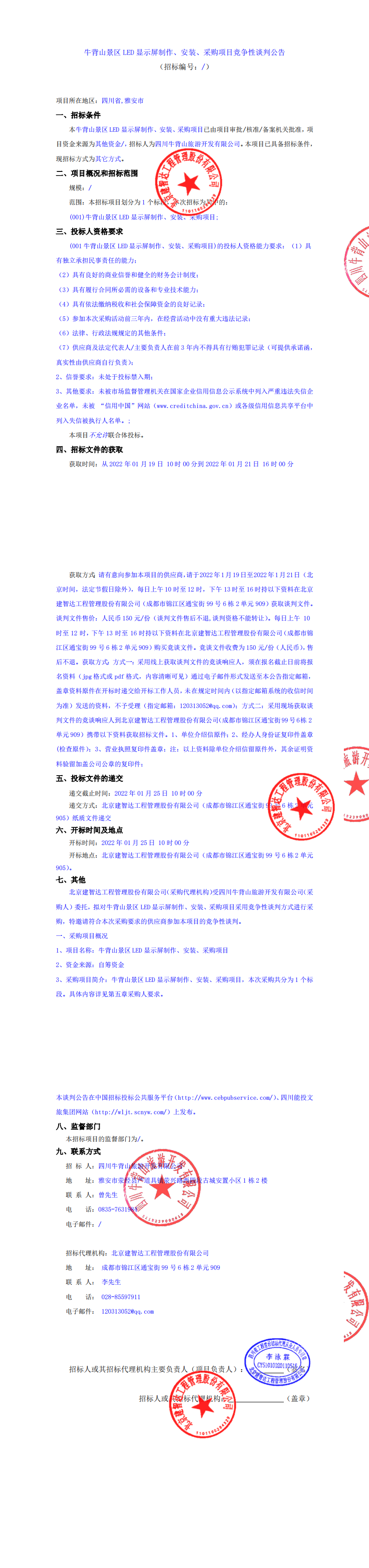 牛背山景区LED显示屏制作、安装、采购项目竞争性谈判公告