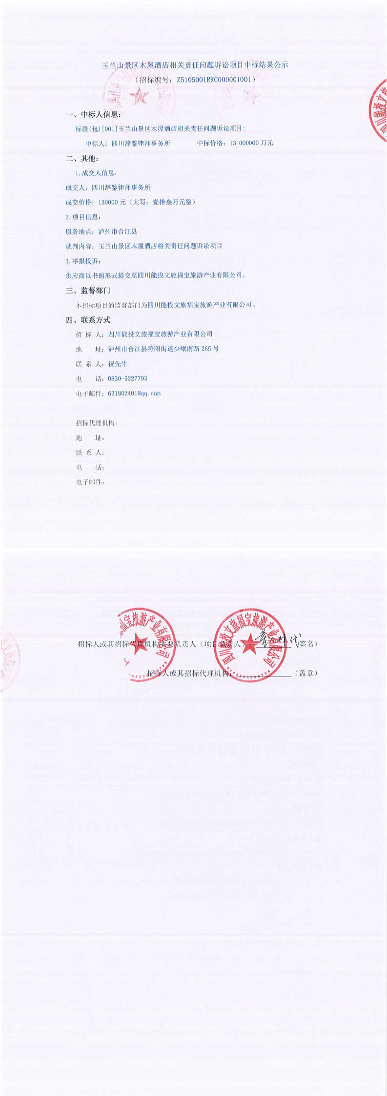 玉兰山景区木屋酒店相关责任问题诉讼项目中标结果公示