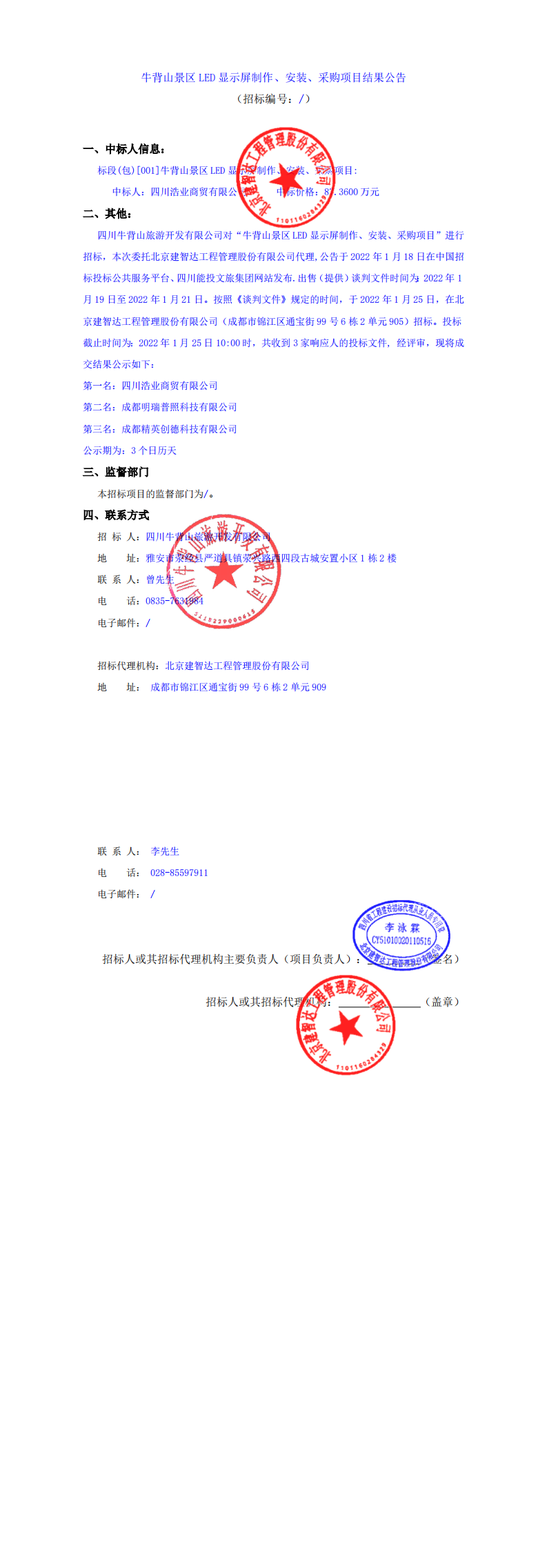牛背山景区LED显示屏制作、安装、采购项目结果公告
