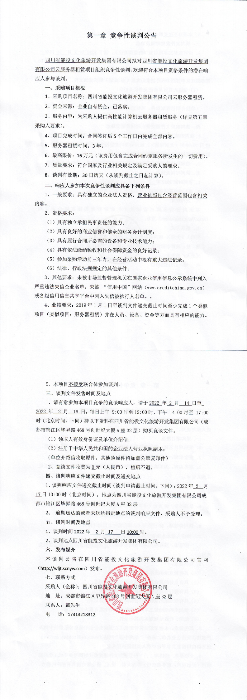 四川能投文旅集团云服务器租赁项目竞争性谈判公告