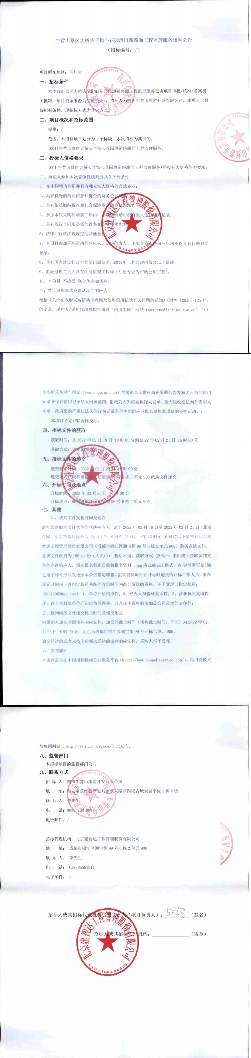 牛背山景区大桥头至街心花园段道路路面工程监理服务谈判公告