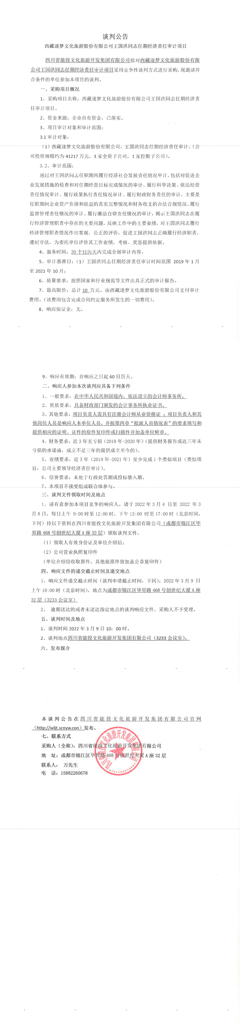 西藏逐梦文化旅游股份有限公司王国洪同志任期经济责任审计项目谈判公告