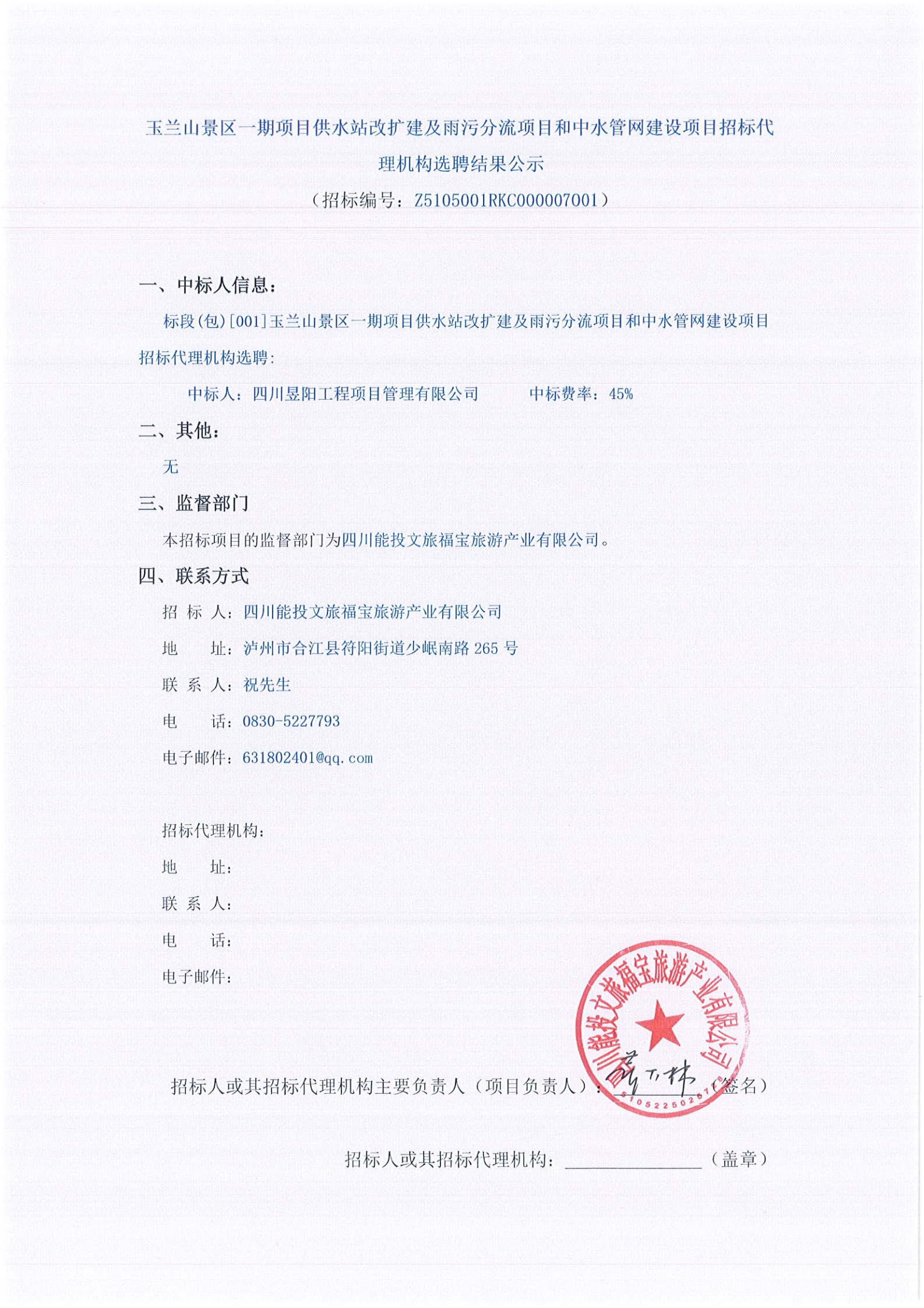 玉兰山景区一期项目供水站改扩建及雨污分流项目和中水管网建设项目招标代理机构选聘结果公示