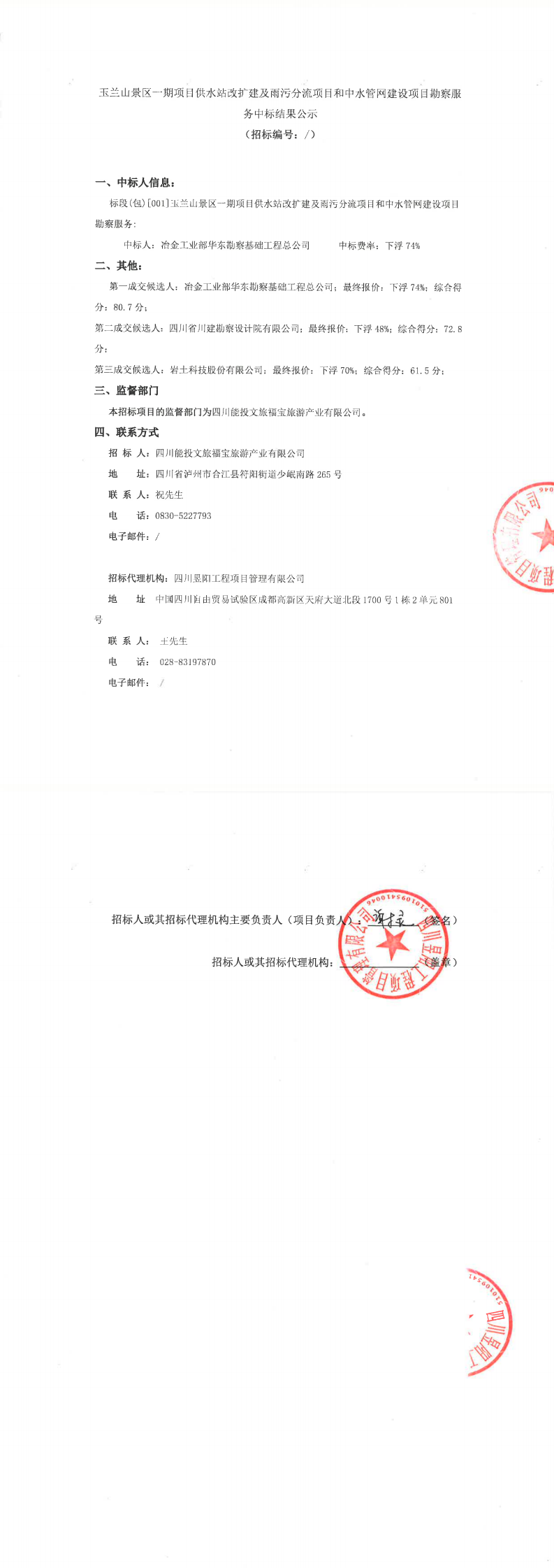 玉兰山景区一期项目供水站改扩建及雨污分流项目和中水管网建设项目勘察服务中标结果公示