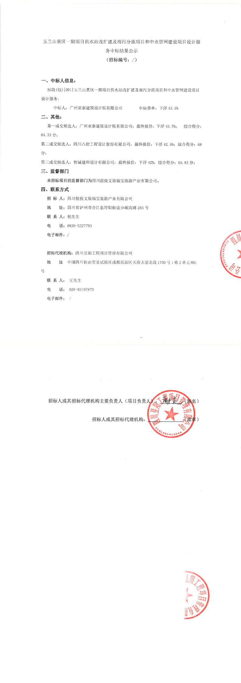 玉兰山景区一期项目供水站改扩建及雨污分流项目和中水管网建设项目设计服务中标结果公示