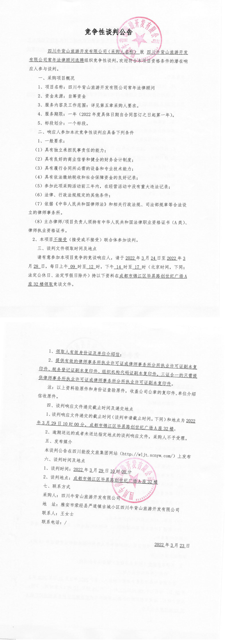 四川牛背山旅游开发有限公司2022年度常年法律顾问选聘竞争性谈判结果公示