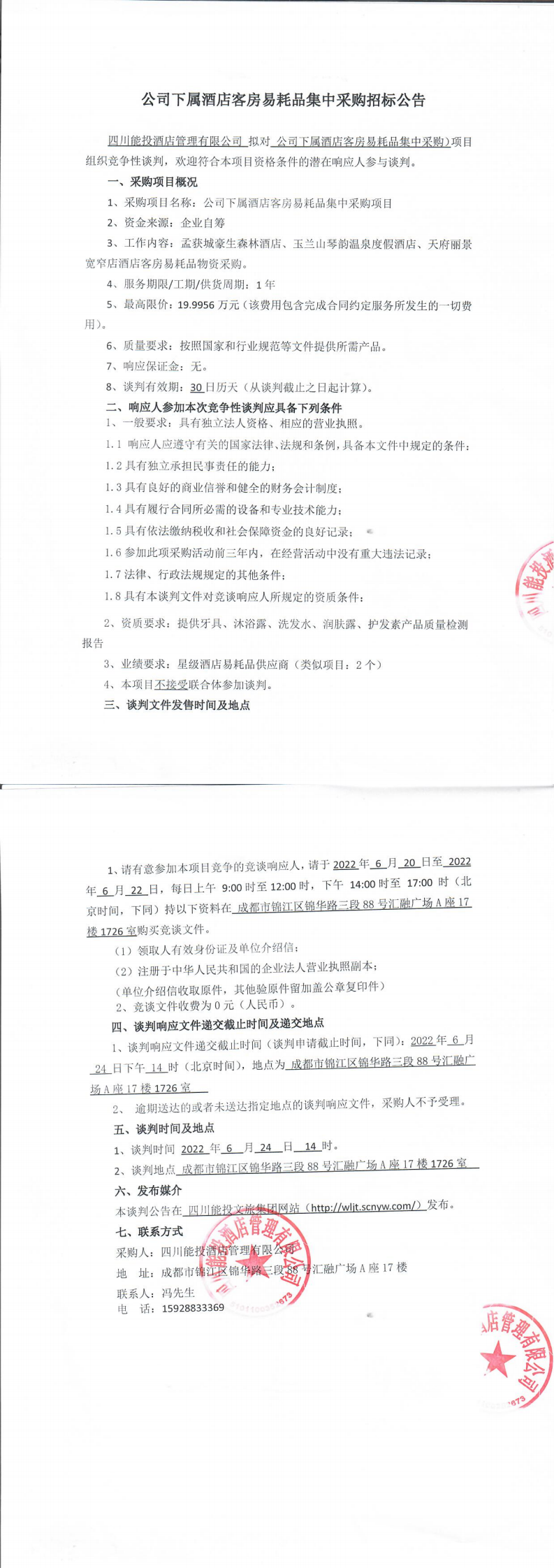 四川能投酒店管理有限公司下属酒店客房易耗品集中采购招标公告