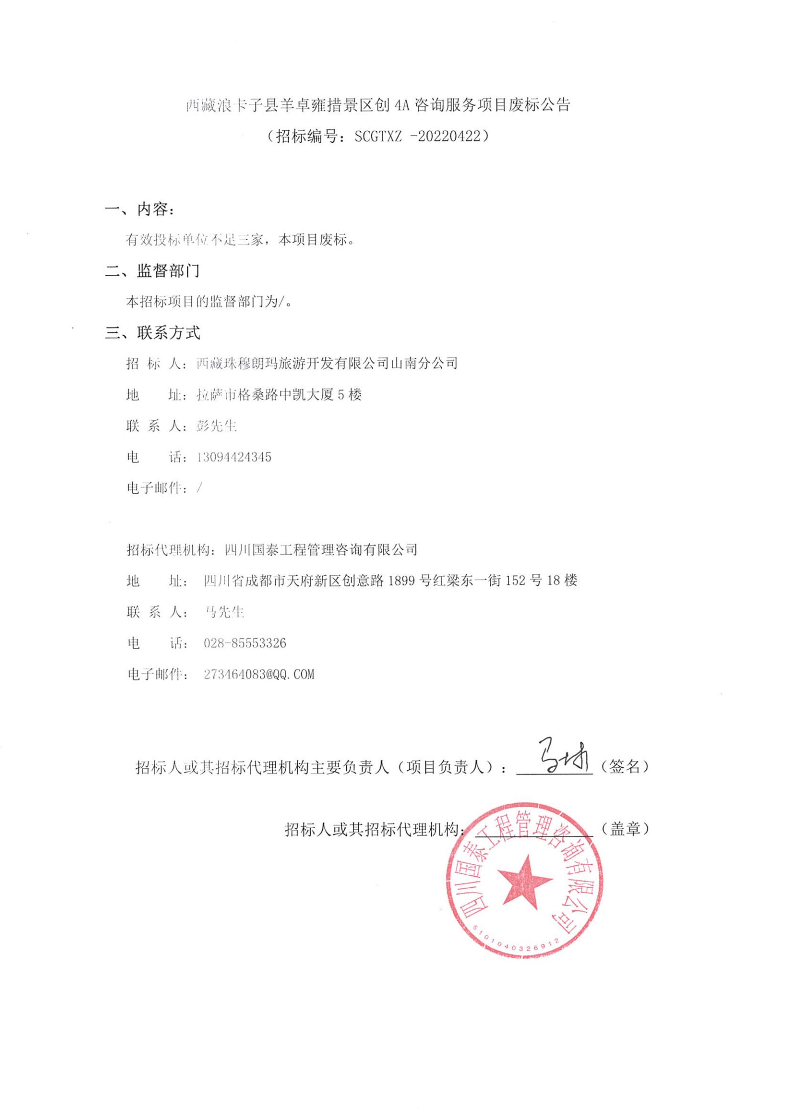 西藏浪卡子县羊卓雍措景区旅游标识系统采购项目废标公告