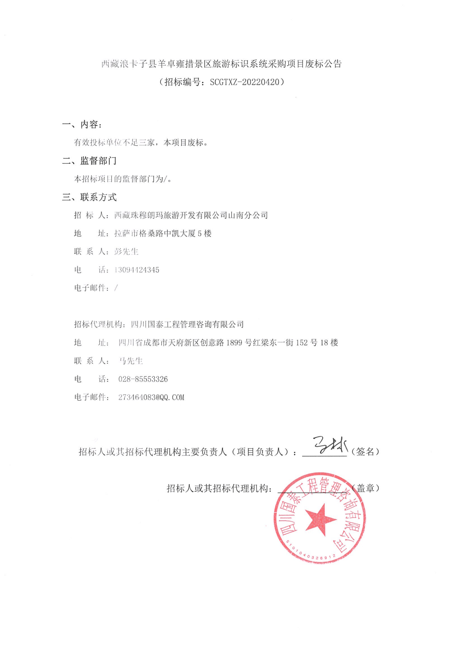 西藏浪卡子县羊卓雍措景区旅游标识系统采购项目废标公告