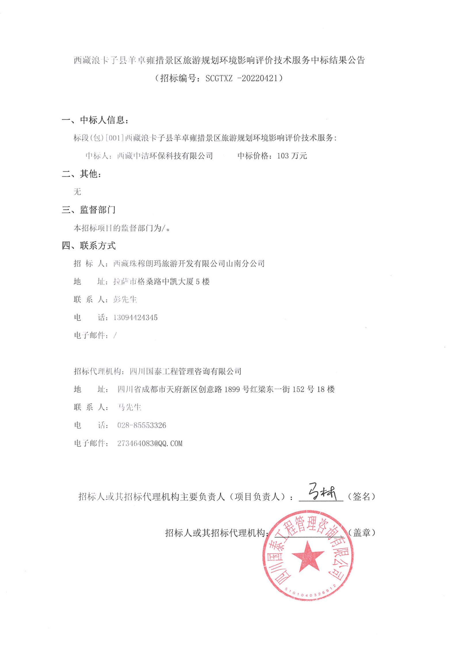 西藏浪卡子县羊卓雍措景区旅游规划环境影响评价技术服务中标结果公告