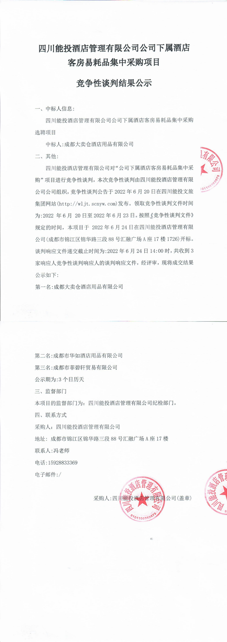 四川能投酒店管理有限公司下属酒店客房易耗品集中采购项目竞争性谈判结果公示
