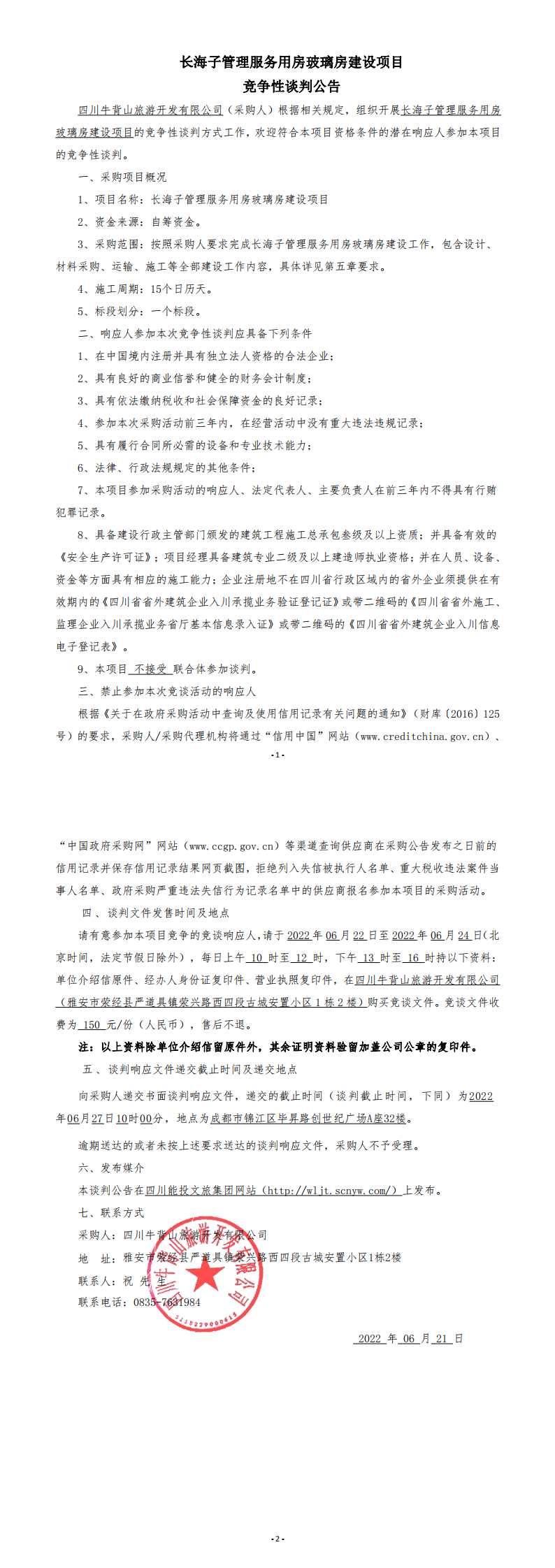 长海子管理服务用房玻璃房建设项目竞争性谈判公告