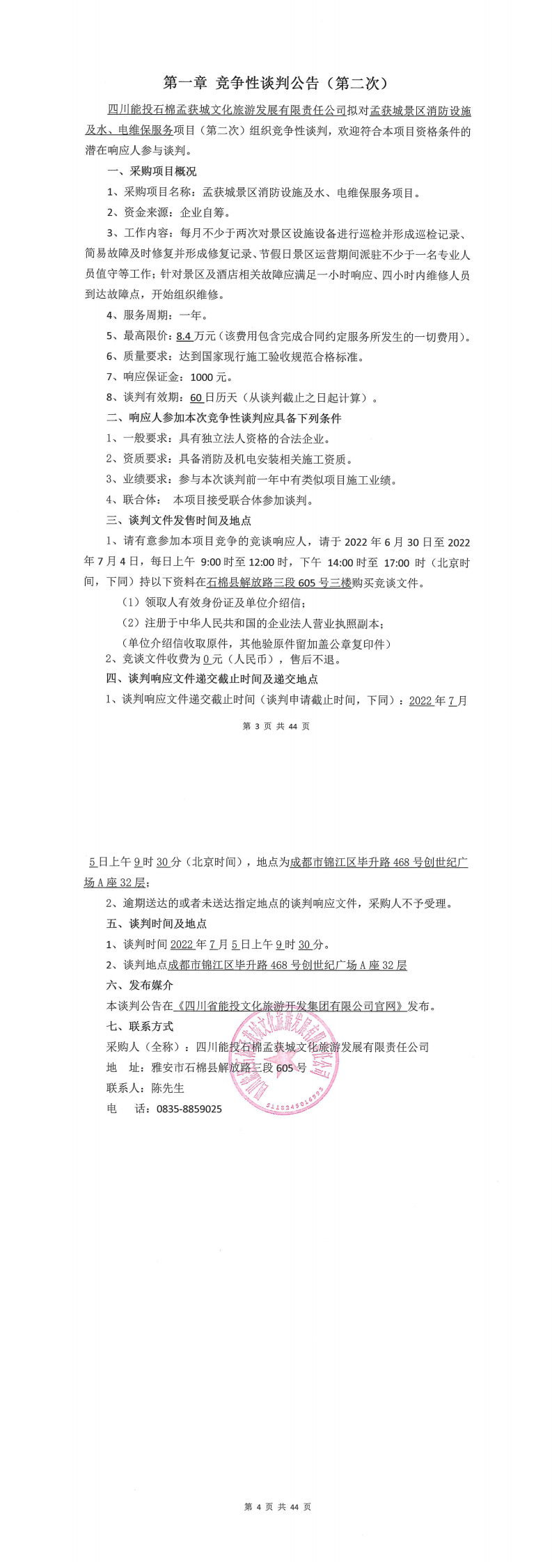 孟获城景区消防设施及水、电维保服务项目竞谈公告(第二次)