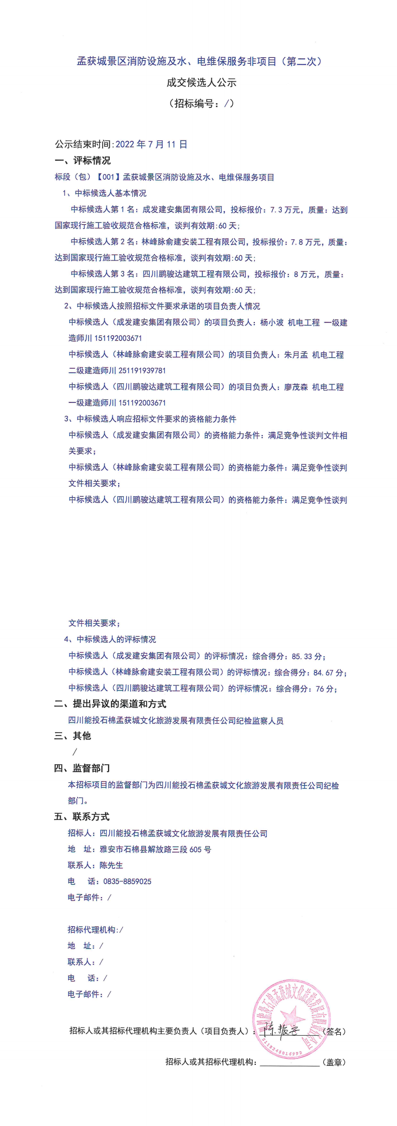 孟获城景区消防设施及水、电维保服务非项目(第二次)成交候选人公示