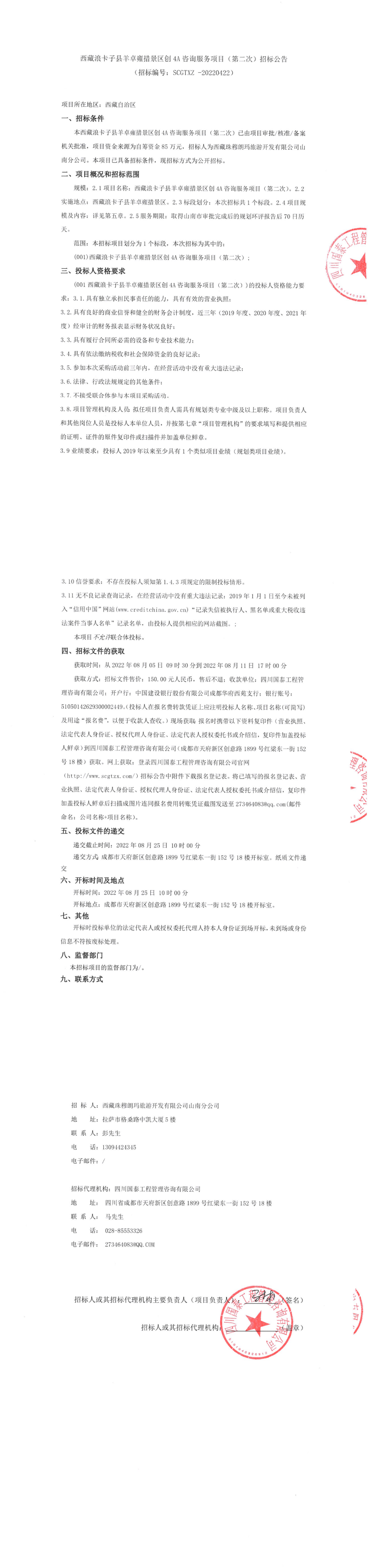 西藏浪卡子县羊卓雍措景区创4A咨询服务项目(第二次)招标公告