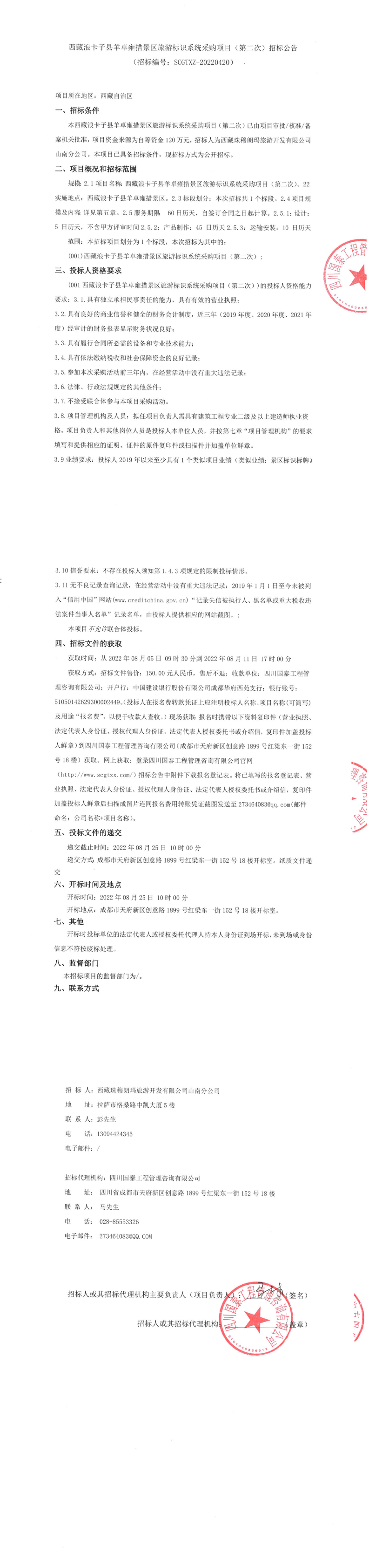 西藏浪卡子县羊卓雍措景区旅游标识系统采购项目(第二次)招标公告