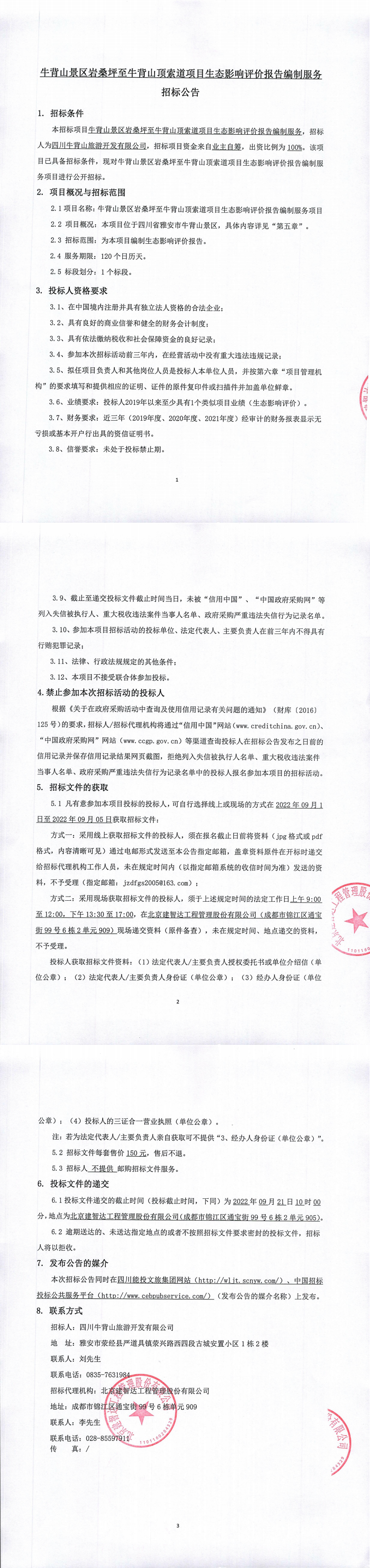 牛背山景区岩桑坪至牛背山顶索道项目生态影响评价报告编制服务招标公告
