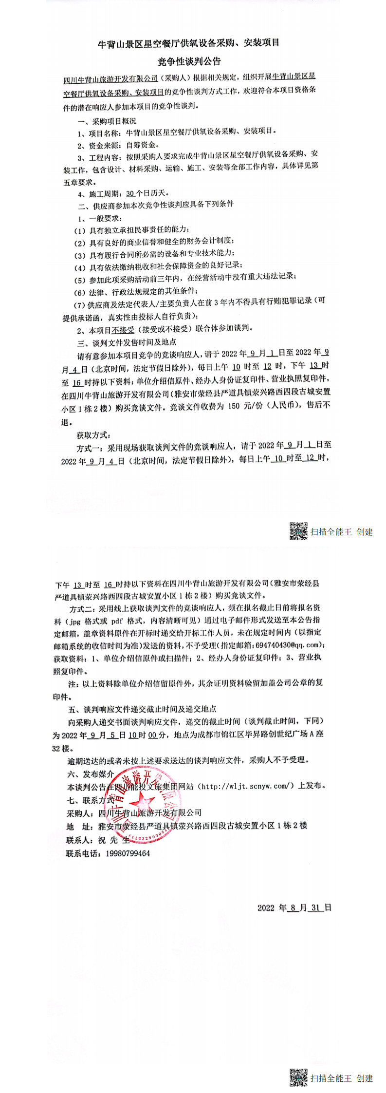牛背山景区星空餐厅供氧设备采购、安装项目竞争性谈判公告