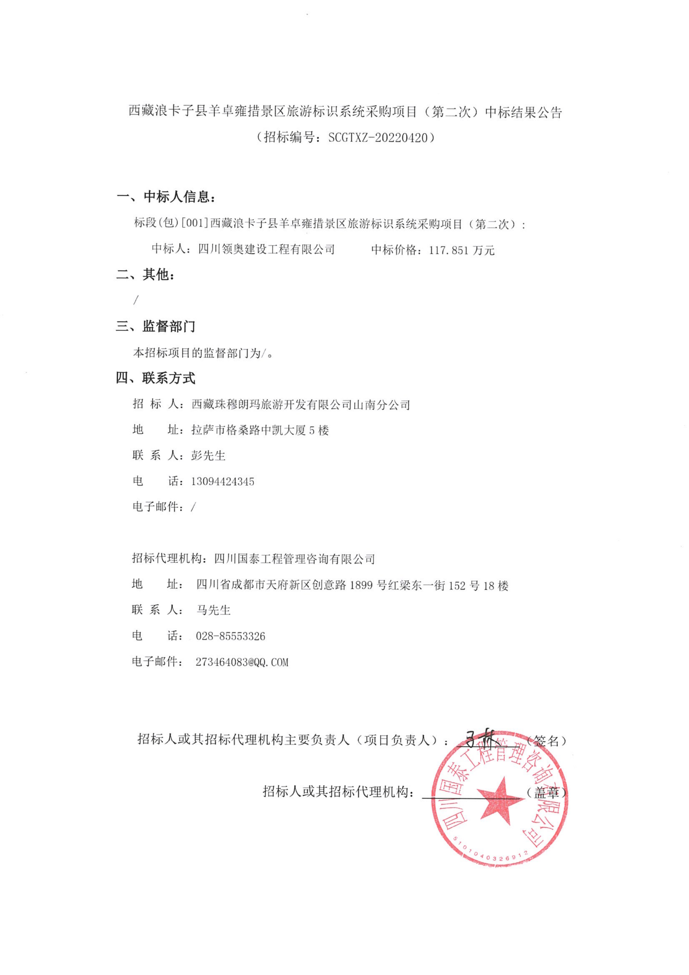 西藏浪卡子县羊卓雍措景区旅游标识系统采购项目(第二次)中标结果公告