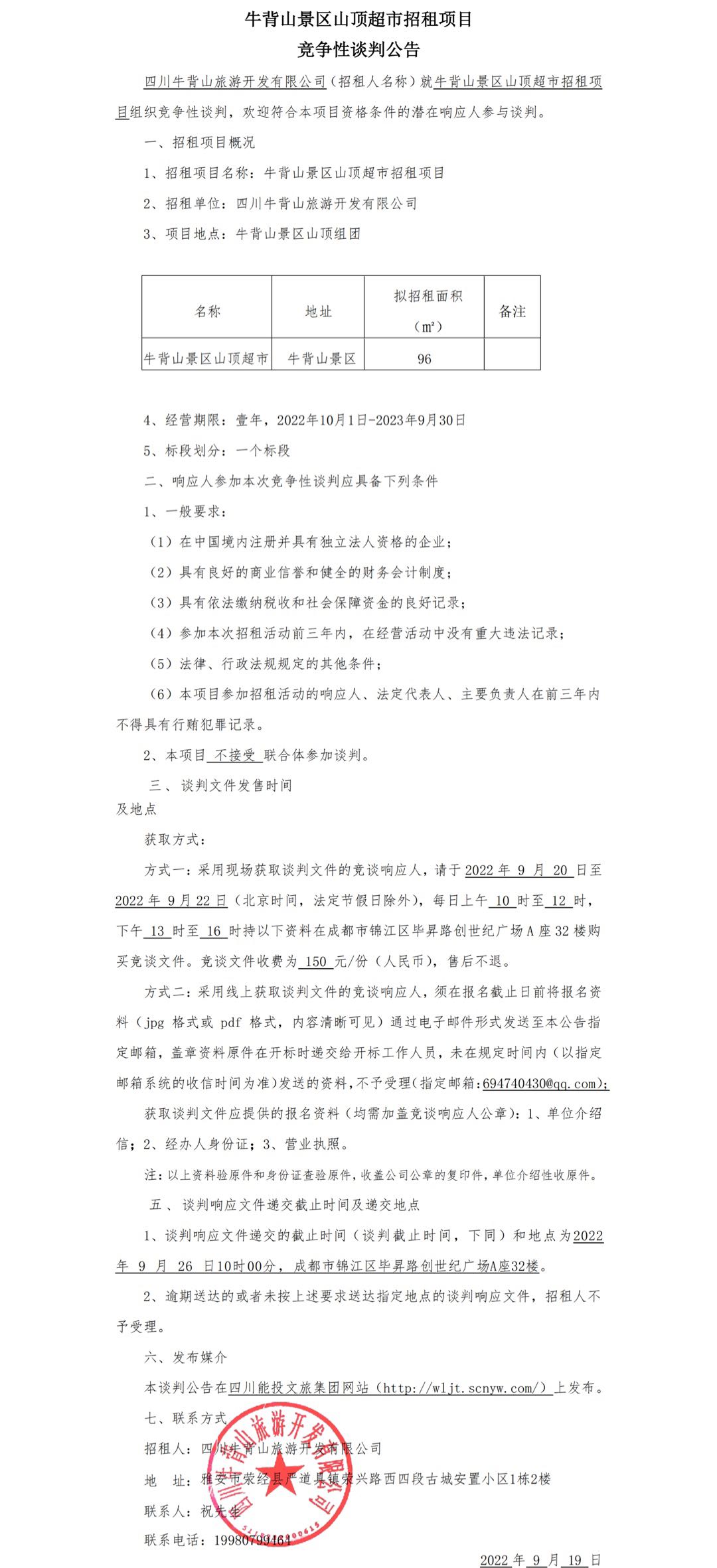 牛背山景区山顶超市招租项目竞争性谈判公告