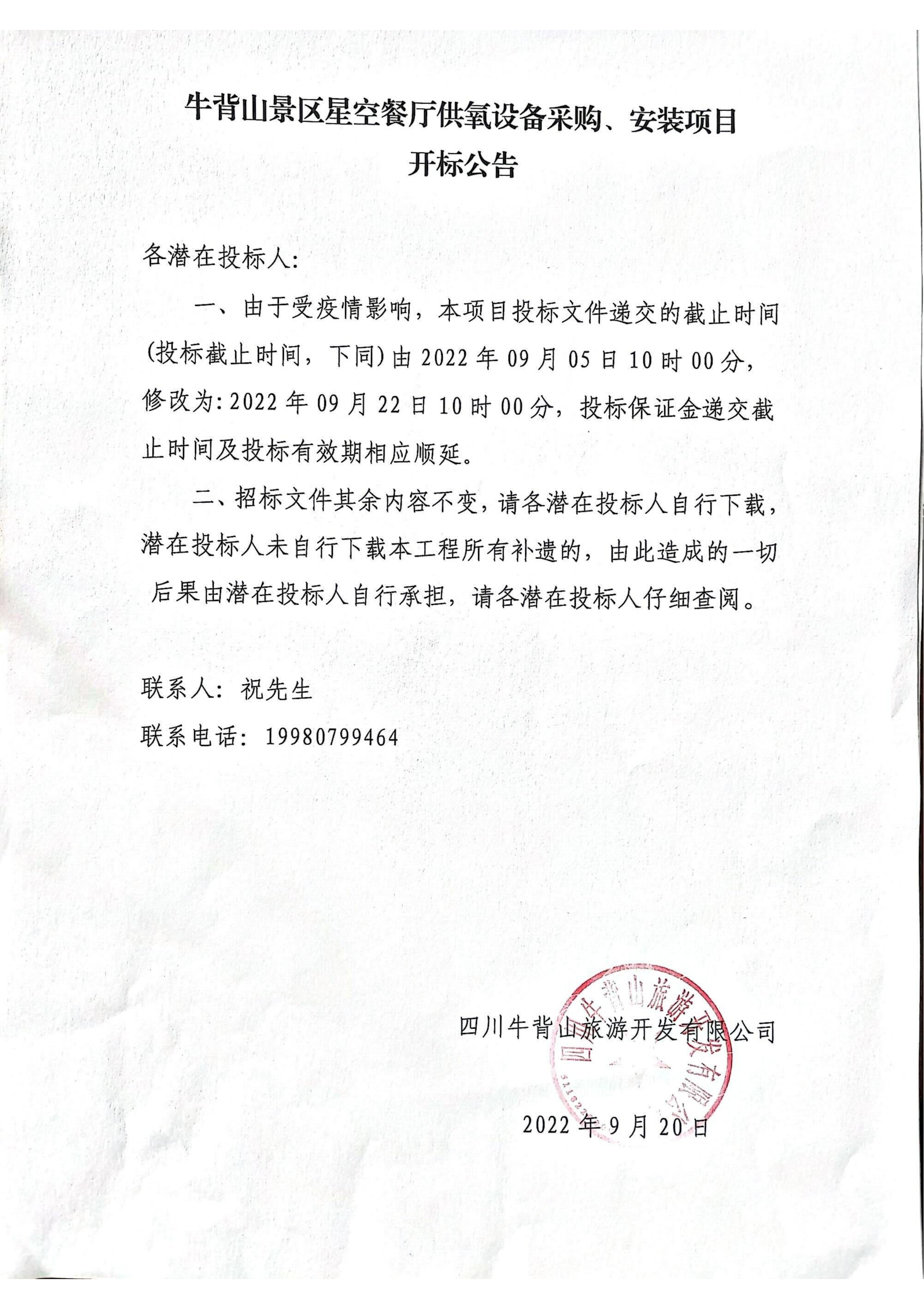 牛背山景区星空餐厅供氧设备采购、安装项目开标公告