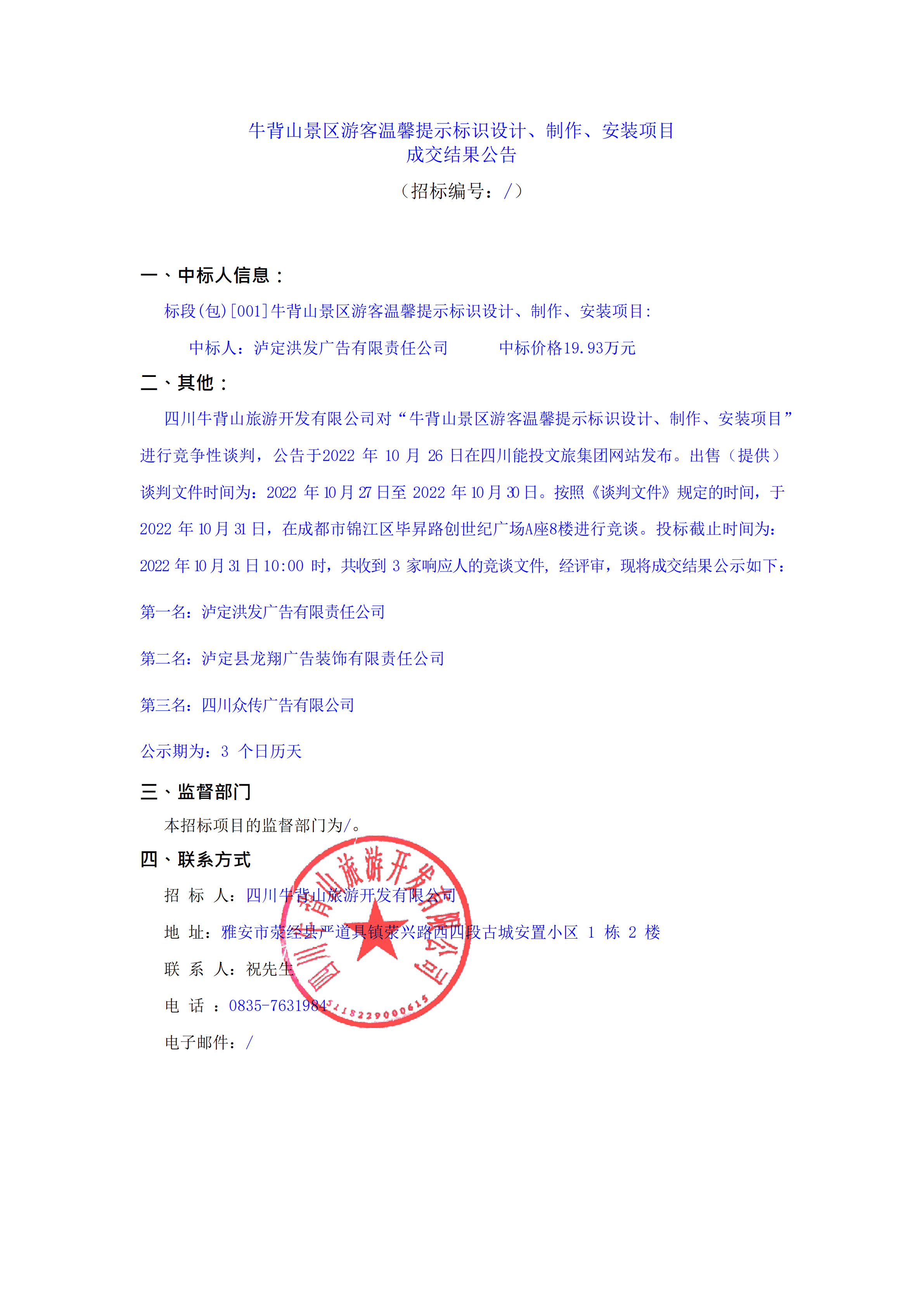 牛背山景区游客温馨提示标识设计、制作、安装项目成交结果公告