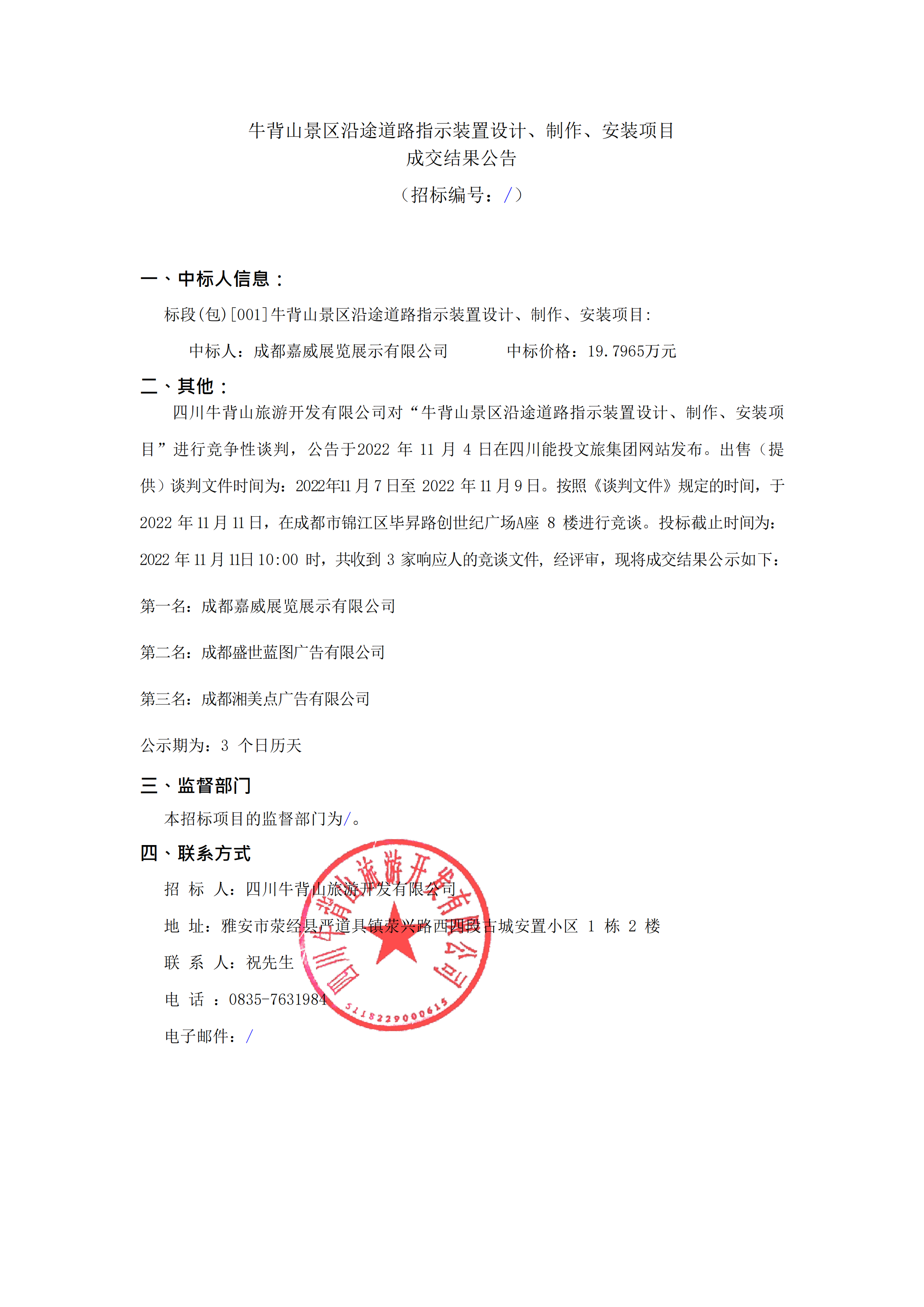 牛背山景区沿途道路指示装置设计、制作、安装项目成交结果公告