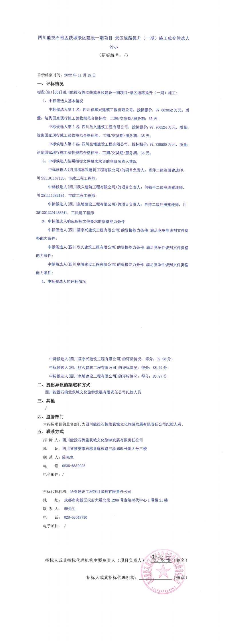四川能投石棉孟获城景区建设一期项目-景区道路提升(一期)施工成交候选人公示