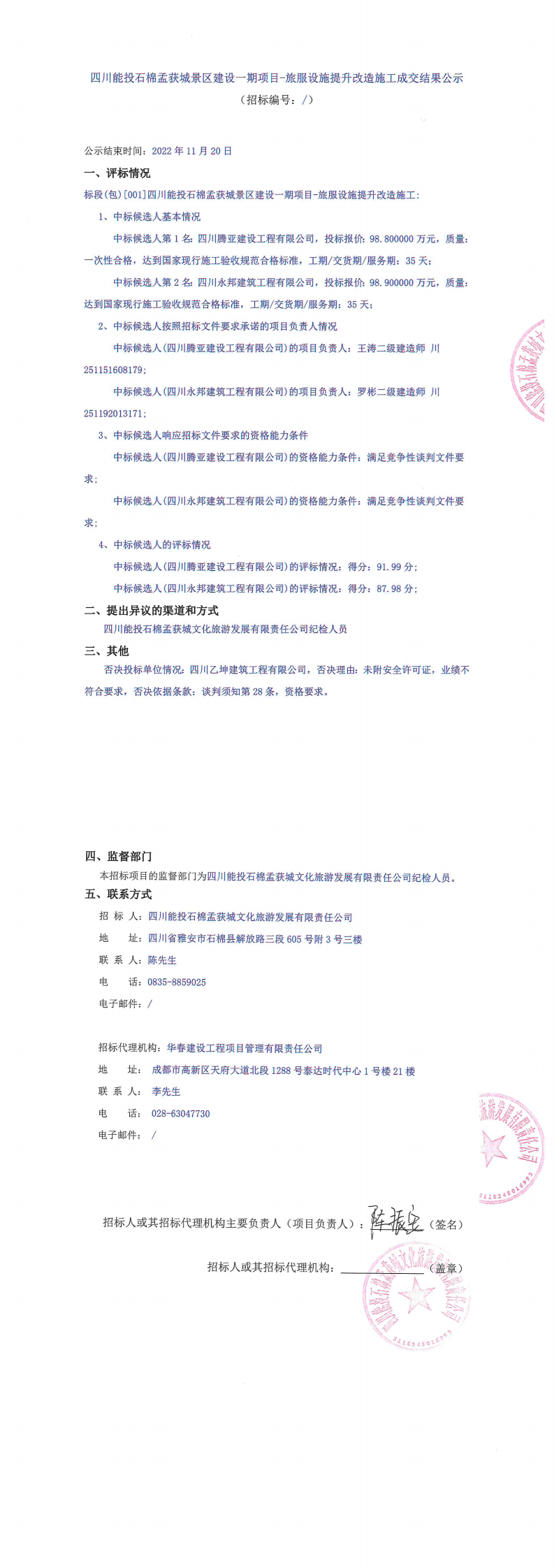 四川能投石棉孟获城景区建设一期项目-旅服设施提升改造施工成交结果公示
