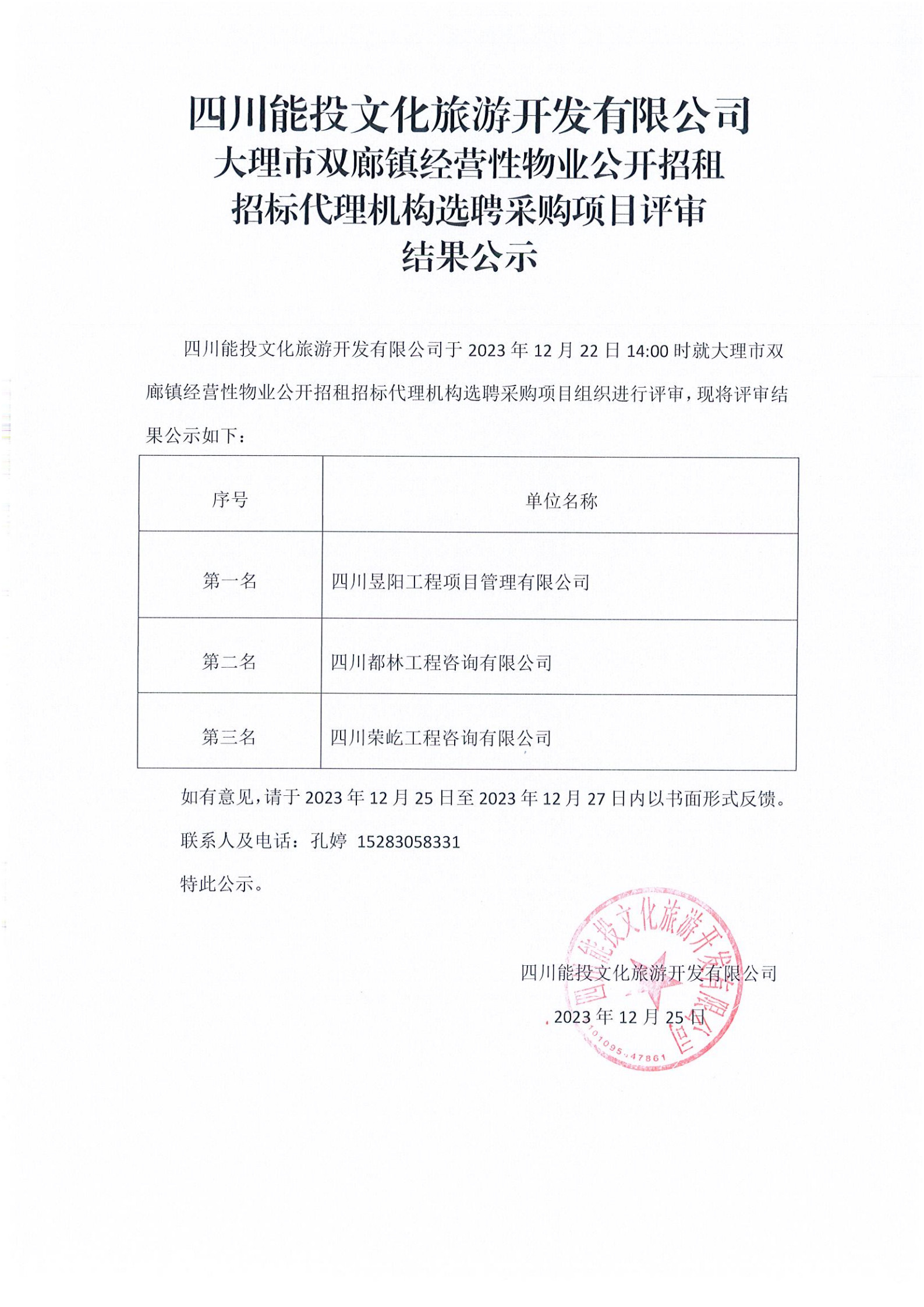 四川能投文化旅游开发有限公司大理市双廊镇经营性物业公开招租招标代理机构选聘采购项目评审结果公示